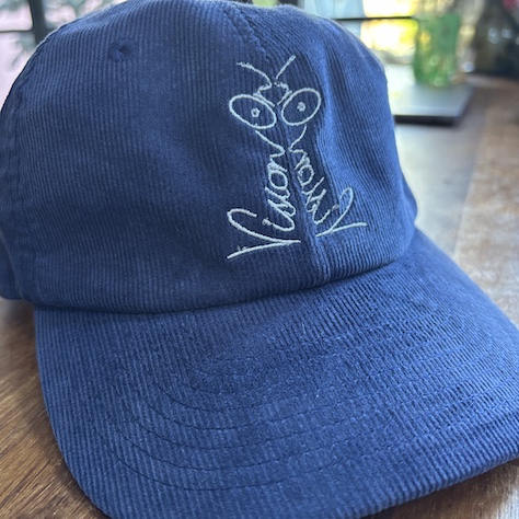 PLEASE NOTE, THESE HAVE BEEN ORDERED AND ARE BEING MADE AND WILL BE IN AND SENT OUT AROUND 28TH APRIL AFTER EASTER!!! Vision On grasshopper embroidered onto very fine 6 panel corduroy hat. This is the navy blue version. Has a strap and buckle at the back to adjust size. Very cool indeed. Only 11 available. There was 12 but my kid nicked one.