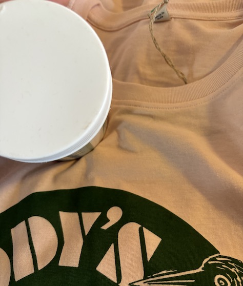 Possibly my fave UK bird is the lesser spotted woodpecker. And here is one, pecking his way into an LP. Yes, this is the super rare Woody's Record Shop bag (originally the shop was in Ferndown, Dorset), now immortalised in tee form. Great colour combo, dusty pink tee with green print. AMAZEBALLS. The tee looks like a pale white, but it is actually a pale dusty pink (I have taken a bad pic along with something white so you can see below). Organic cotton tee - please note size chart: